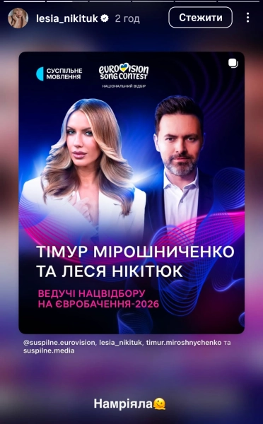Українська телезірка Леся Нікітюк виступить однією з ведучих у Національному відборі на Євробачення-2026. Разом з нею вести програму буде Тимур Мірошниченко, а Анна Тульєва займе позицію ведучої передшоу.