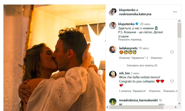 “Схоже, у нас радісна звістка P.S. Любов – це сяйво. Більше інформації чекайте”, – поділився Клопотенко, додавши смайлик кільця.