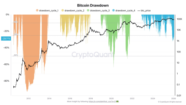Дану корекцію аналітик Darkfost розцінив як найбільшу в поточному циклі, а саме приблизно 30% від максимуму. Проте, він зауважив, що це зниження все ще знаходиться в рамках середнього діапазону для даного ринкового циклу.