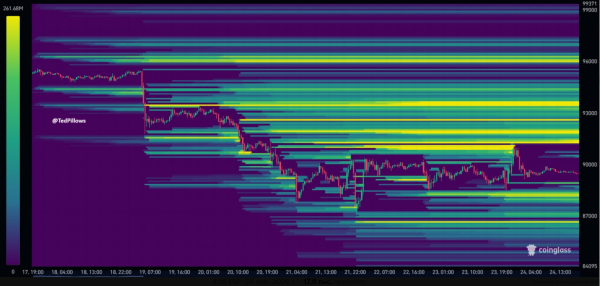 Водночас, популярний у криптографічній спільноті аналітик Тед Піллоуз вивчив розміщення ліквідності на ринку. Вона активно збирається на відмітках нижче поточної вартості — в зонах $88 000 та $86 500. З іншого боку, на шляху догори біткоін зустрічає великі кластери в діапазоні від $92 000 до $96 000.
