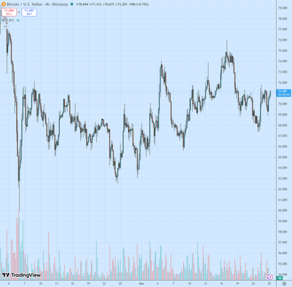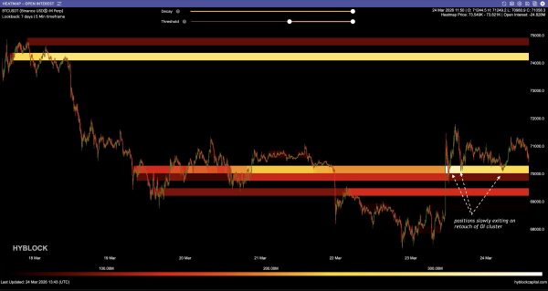24 березня ціна біткоїна ( $BTC ) перевірила як підтримку пройдений догори попередній опір у діапазоні $69 000-69 300, надалі спостерігалися покупки до нещодавніх максимумів, які були досягнуті в середу вранці.