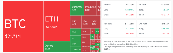 За даними Coinglass, за останні 24 години ліквідації коротких позицій за біткоїном ($46 млн) були аналогічні ліквідаціям довгих позицій ($45,7 млн).