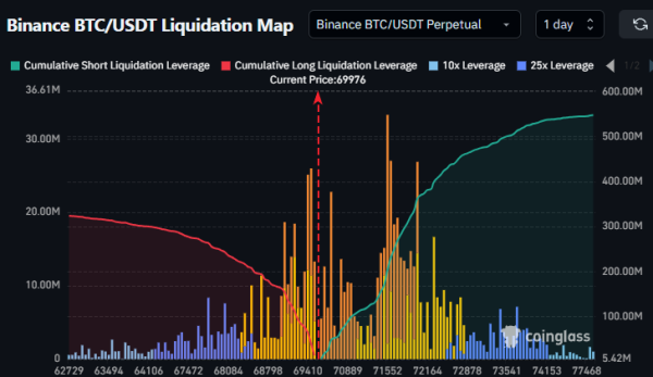 Аналітик Daan Crypto Trades вказав на формування ліквідаційних кластерів у безстрокових контрактах на біткоїн на рівнях $69 000 і $71 500. Прорив одного з них створить передумови для закриття позицій і додасть динаміки руху в бік пробою.
