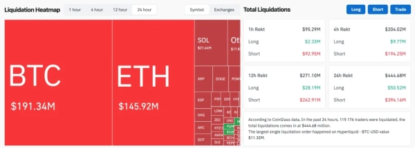 Обсяг ліквідованих позицій сягнув $444 млн за добу. Значна частина примусово закритих позицій прийшлася на короткі позиції — $50 млн.
