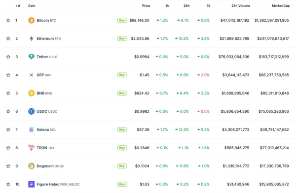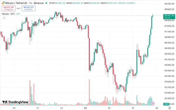 За минулу добу вартість провідної криптовалюти зросла на 6%. На час публікації статті, актив торгується на рівні близько $68,400.