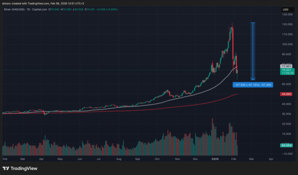 Ринок коштовних металів пережив історичний обвал. Срібло здешевшало на 20% за день 5 лютого, опустившись нижче за $71 за унцію. Від найвищих значень кінця січня ($120-130 за унцію) зниження склало близько 36%. Крах срібла посилив паніку на фінансових ринках, оскільки інвестори масово виходили з ризикованих активів.
