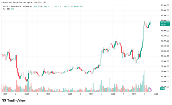 Ввечері сьомого квітня 2026 року США та Іран уклали договір про зупинку воєнних дій на період у два тижні, що було підтверджено президентом Дональдом Трампом. На цьому тлі фондовий та криптовалютний сектори продемонстрували позитивну активність, зокрема біткоїн перетнув позначку в $72 000.
