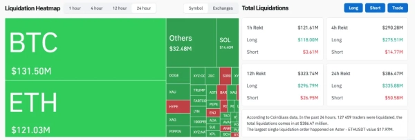 Обсяг ліквідацій за останні 24 години досяг $389 млн. Значна частина ($335 млн) припала на довгі позиції.