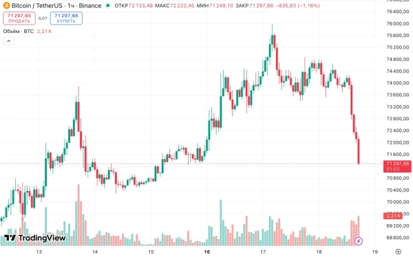 18 березня вартість головної криптовалюти впала нижче відмітки у $72 000, зменшившись майже на 4% за 24 години. Загострення протистояння на Середньому Сході спровокувало стрімке зростання цін на нафту, збільшивши занепокоєння щодо інфляції.
