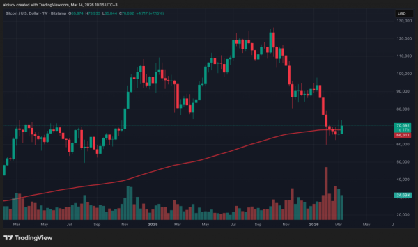 Після появи статистики біткоїн оновив локальний максимум поблизу $74 000 і піднявся над 200-тижневою експоненційною ковзною середньою (EMA) — значною лінією спротиву, яку ринок безуспішно атакував у ході попередніх спроб підйому.