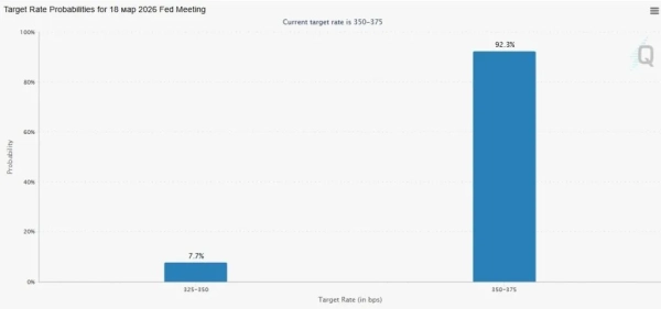 Ринки свопів та опціонів висловлюють майже повну впевненість у збереженні ФРС поточного діапазону ключової ставки 3,5-3,75% за підсумками засідання 18 березня. Вірогідність даного сценарію оцінюється у 92,3%. За минулу добу значення збільшилось на 0,7%, за місяць додало 10,7%.