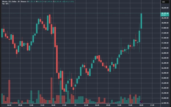 Після публікації прес-релізу BLS котирування біткоїна почали зростати, піднявшись з рівнів в районі $67 300 до $68 500.