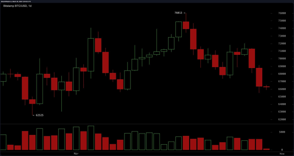 Коливання ціни на добовому графіку біткоїна віддзеркалювали продовження більш широкої тенденції до зниження, що настала після нижчого піку близько 76 000 доларів. Теперішня зона в межах 66 000-67 000 доларів виступила як тимчасова опора, але нездатність повернути вищі позиції підкреслює існуючу слабкість.