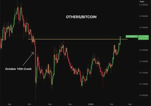 Він також зауважив, що індекс OTHER/ $BTC досяг чотиримісячного піку і знаходиться вище значень, що були на момент обвалу 10 жовтня 2025 року.