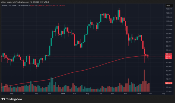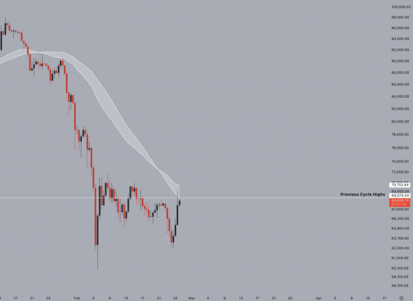 За інформацією Bitstamp, 26 лютого актив повернувся до позначки $67488, знецінившись на 1% за добу. Днем раніше біткоїн піднімався до $70 040, роблячи спробу повернути дві важливі відмітки: 200-тижневу експоненційну ковзну середню (EMA) та попередній історичний максимум 2021 року. Обидві старання завершилися без успіху.