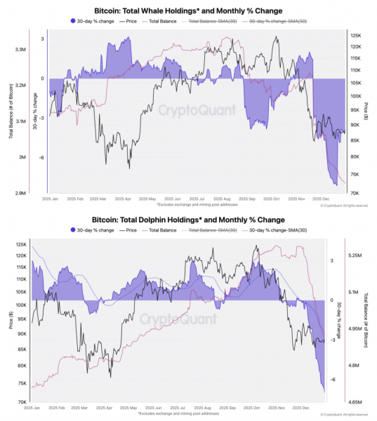 Після того, як ці біржові викривлення усуваються, дані показують, що великі гравці продовжують розподіляти біткоїн, а не накопичувати його. Як наслідок, загальні залишки китів продовжують скорочуватися. Залишки адрес з 100-1 000 BTC також зменшуються – тенденція, яка вказує на триваючий відтік коштів з біржових фондів (ETF).