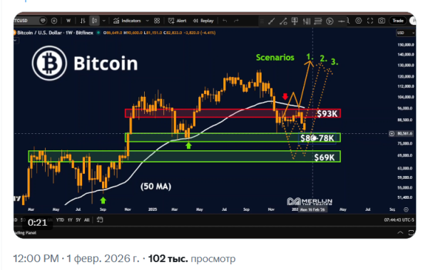 Експерт Merlijn The Trader ідентифікував даний діапазон як найбільш значущий у циклі. Основна зона підтримки лежить між $78 000 та $80 000. У разі прориву цього рівня, песимістичний сценарій передбачає спад до $69 000.