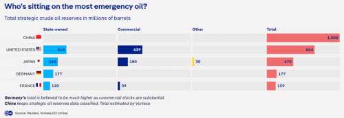 Вважається, що Китай володіє найбільшими резервами на випадок надзвичайних ситуацій — щонайменше на 50% більше, ніж у США. Хоча Пекін ретельно приховує точні цифри, аналітична компанія Vortexa, що спеціалізується на енергетиці та судноплавстві, оцінила загальні запаси держави в 1,3 мільярда барелів.
