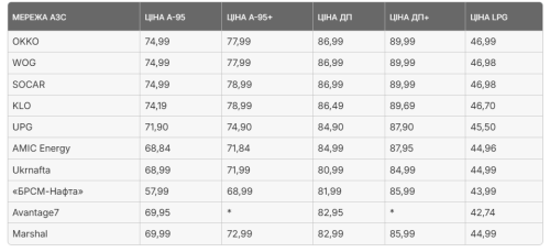 Ціни в найбільших мережах АЗС станом на 25 березня. Фото: НафтоРинок