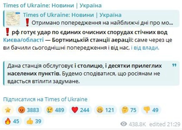 Кілька днів тому деякі Telegram-канали повідомили, що росія нібито може планувати напад на Бортницьку станцію аерації — основні каналізаційні очисні споруди Києва, розташовані в однойменному мікрорайоні на півдні столиці.