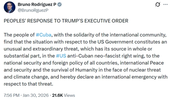 Очільник МЗС Куби Бруно Родрігес заявив про “міжнародний надзвичайний стан” через ситуацію у відносинах зі США. Про це він повідомив у мережі X, повідомляє УНН.