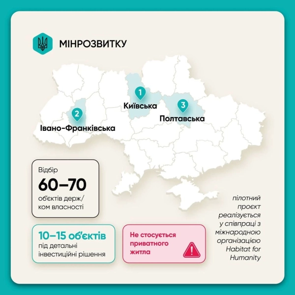 Необхідно зазначити, проєкт втілюється на підставі Закону України №4080-IX, який передбачає додаткові інструменти забезпечення ВПО житлом. На початковому етапі заплановано пілот у трьох областях: Київській, Івано-Франківській та Полтавській. Зараз триває відбір 60–70 об’єктів, з яких для формування детальних інвестиційних висновків повинні відібрати 10–15 – там, де реконструкція є технічно і економічно виправданою.