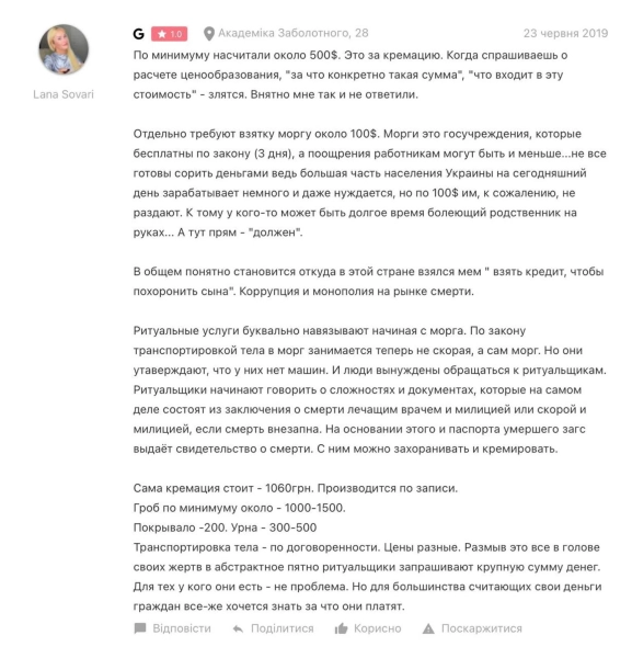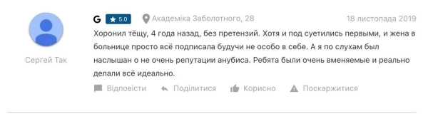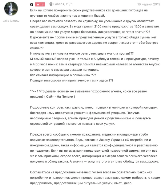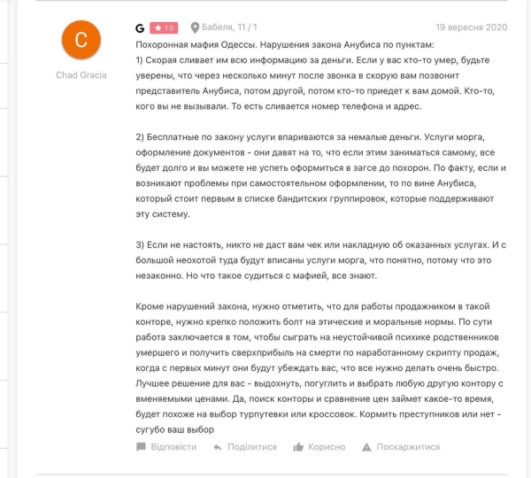 У відгуках про роботу “Анубіса” в Одесі клієнти розповідають про те, що о четвертій ранку до них приходив агент похоронного дому і в напруженій ситуації навʼязував свої послуги. Вони не відкидають, що відомості про померлих похоронному дому “зливають в поліції чи швидкій допомозі”.