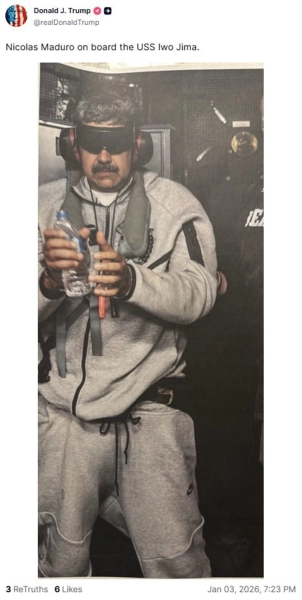 Дональд Трамп оприлюднив знімок Ніколаса Мадуро на палубі авіаносця USS Iwo Jima після його арешту американським спецпідрозділом. Мадуро стане об’єктом судового розгляду в США за обвинуваченнями у наркотичному тероризмі та нелегальному продажу зброї.