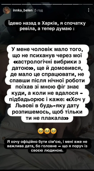Після цього досвіду Інна підкреслила, що для неї найважливішою залишається підтримка коханої людини, а не конкретний день для весілля. В подальшому пара має намір одружитися через додаток “Дія”.