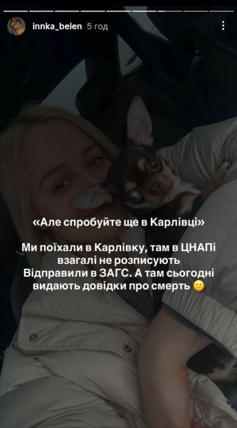 Тріумфаторка романтичного шоу “Холостяк-13”, волонтерка та блогерка Інна Бєлєнь повідомила, що їй і її нареченому Івану не дозволили зареєструвати шлюб у відділах РАЦС. Про це інформує УНН, посилаючись на Instagram-stories медійної особистості.