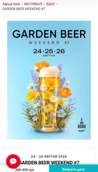 24–26 квітня – Garden Beer Weekend #7 – Київ У культурному осередку ВДНГ (Київ) Garden Beer Weekend #7 відкриється 24–26 квітня 2026 року для тих, хто обожнює крафтове пиво, вуличну їжу та музику на свіжому повітрі. Цей захід навіть потрапив у переліки квиткових сервісів як один з найважливіших фестивальних моментів весни.